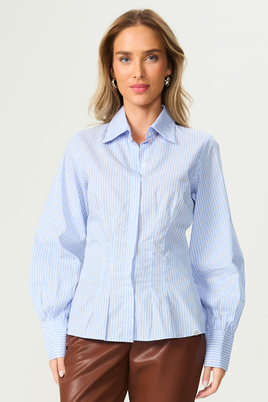 Camisa listrada com pregas azul Fato Básico