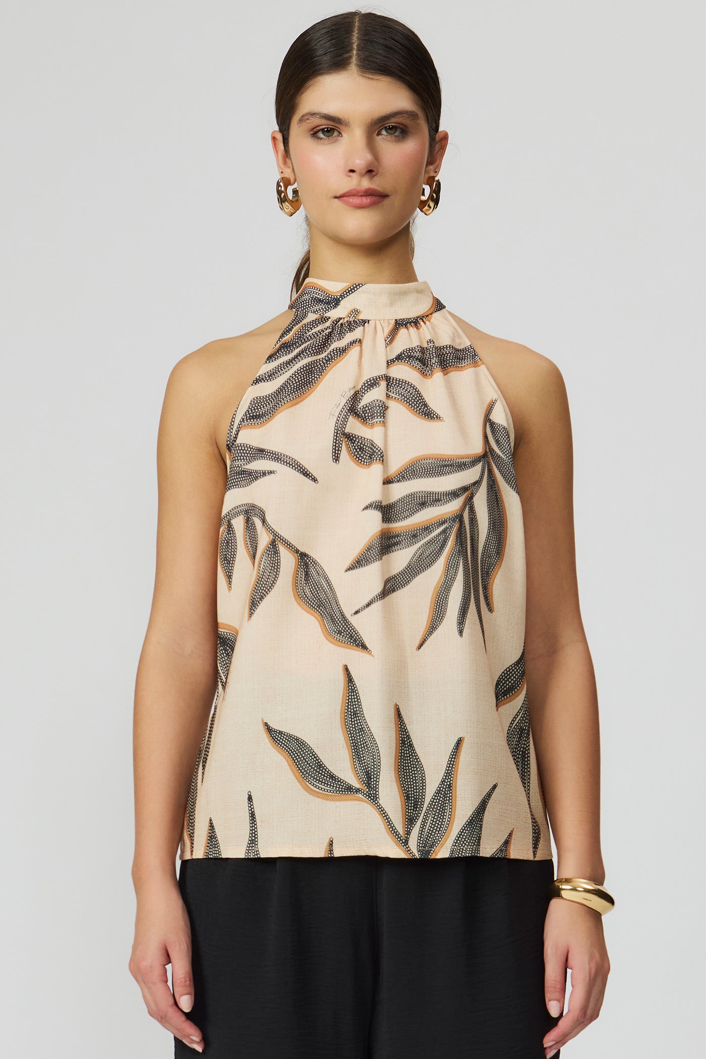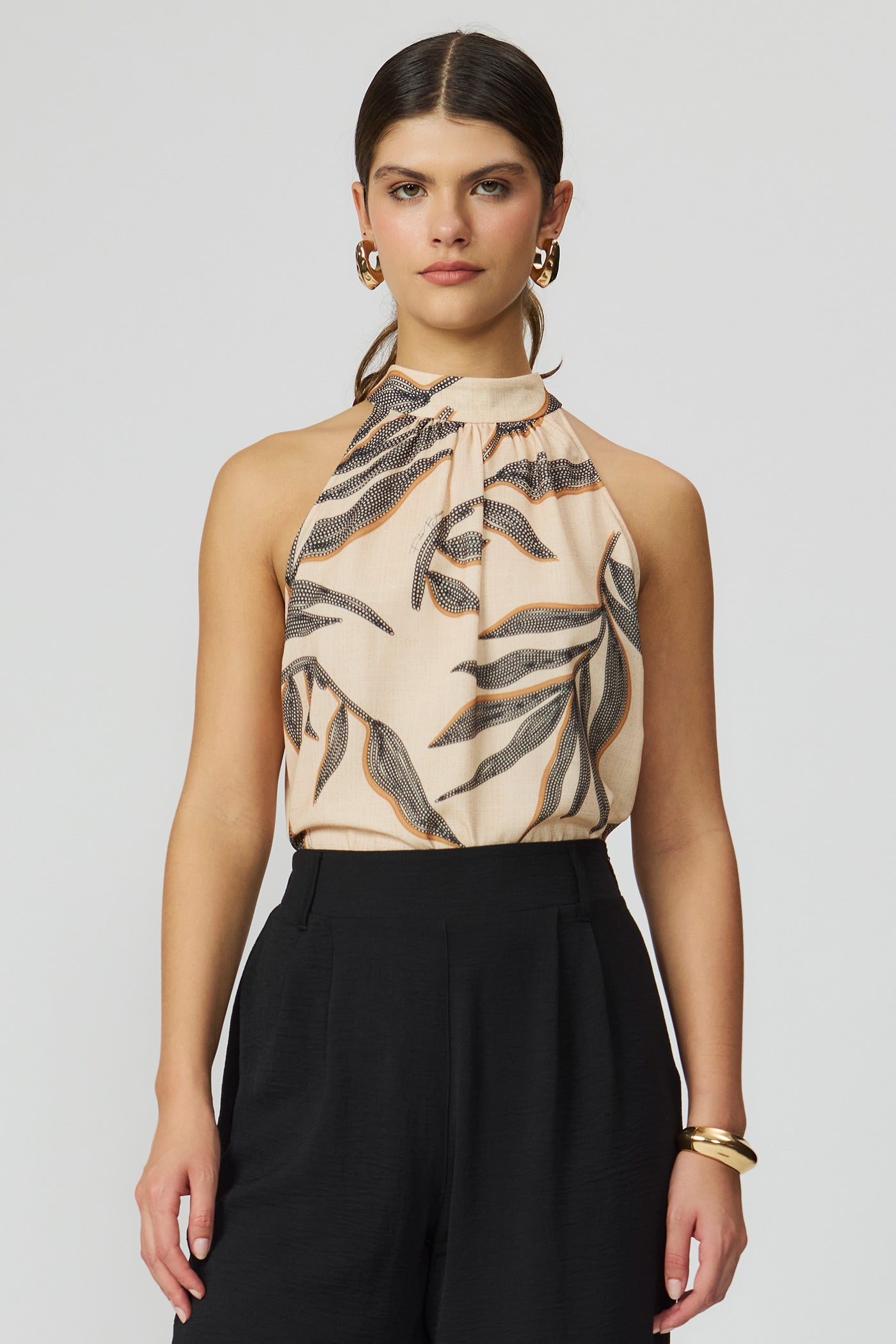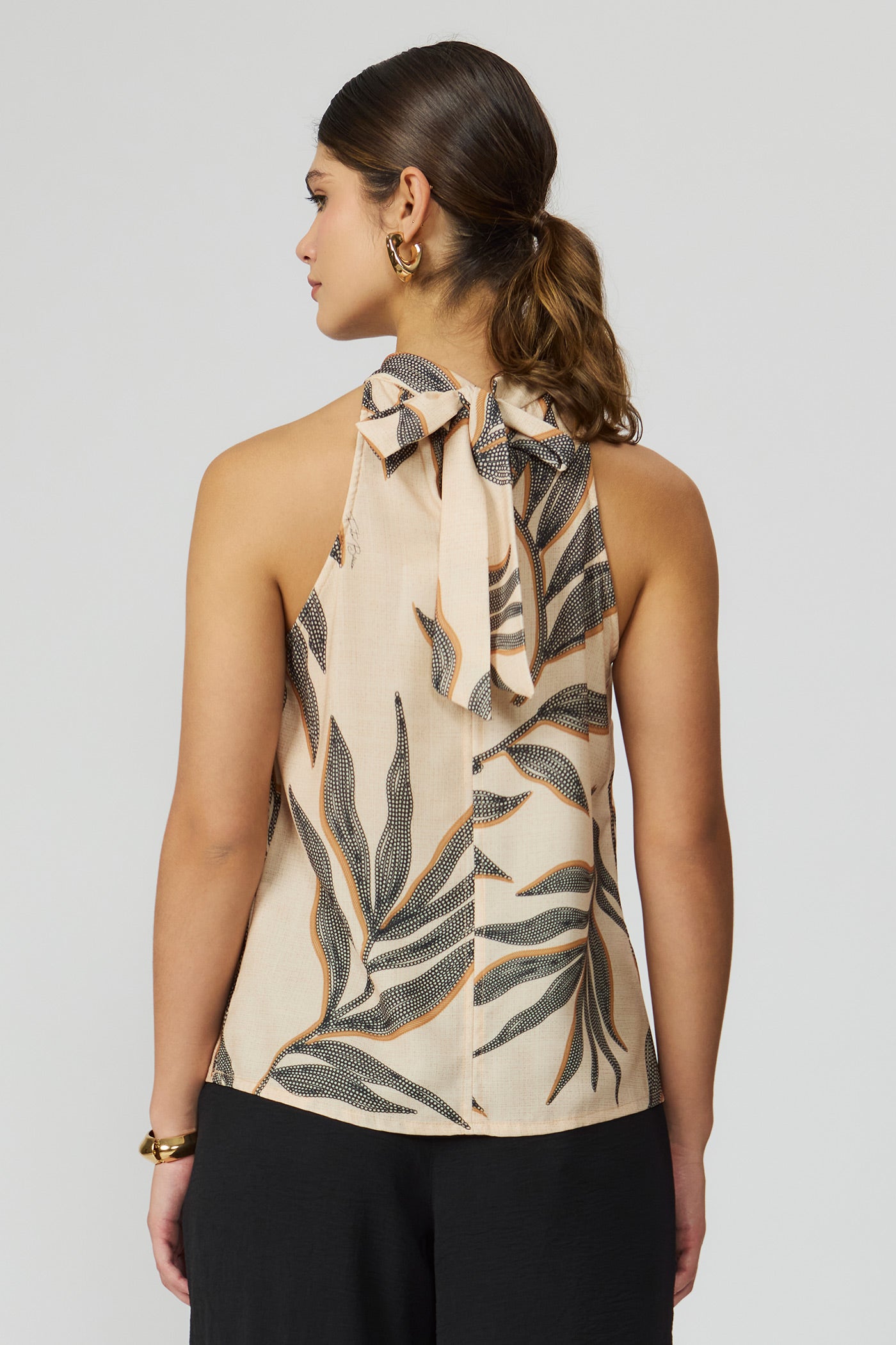 • Design: Blusa sem mangas com gola alta e amarração posterior