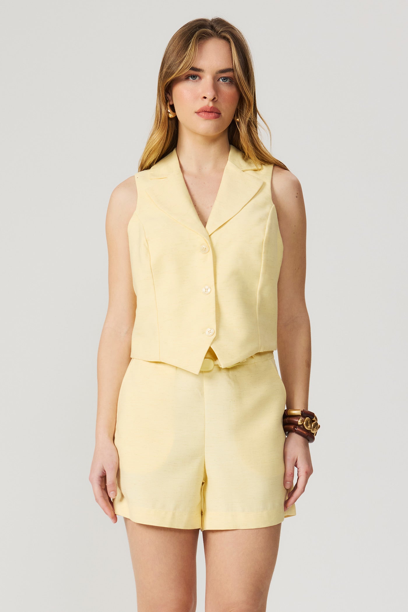 O shorts amarelo manteiga traz frescor e sofisticação em um tom suave e delicado. Confortável e elegante, é ideal para dias ensolarados e composições modernas.