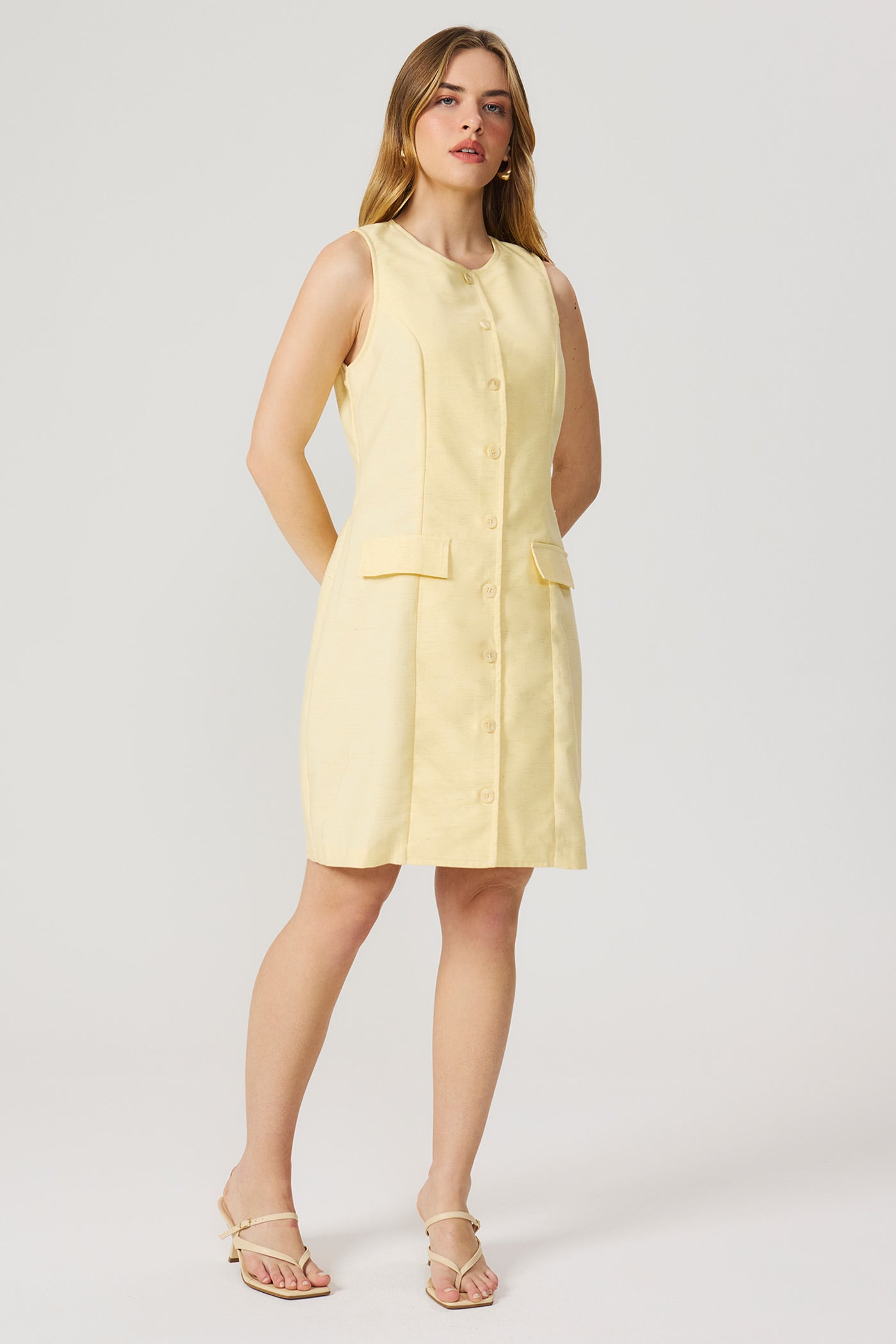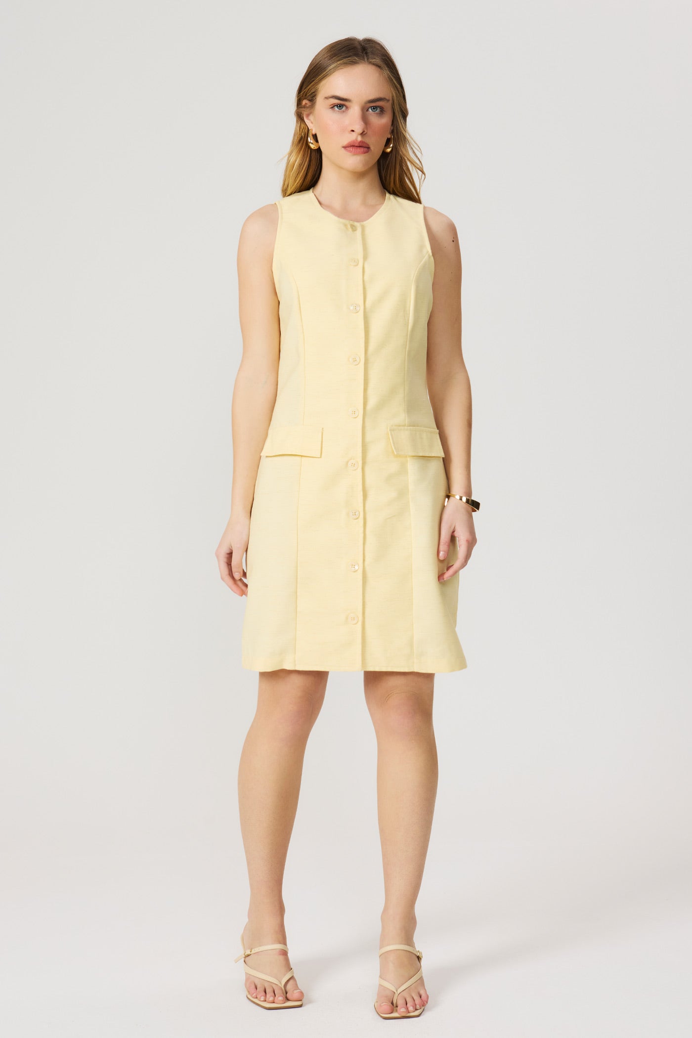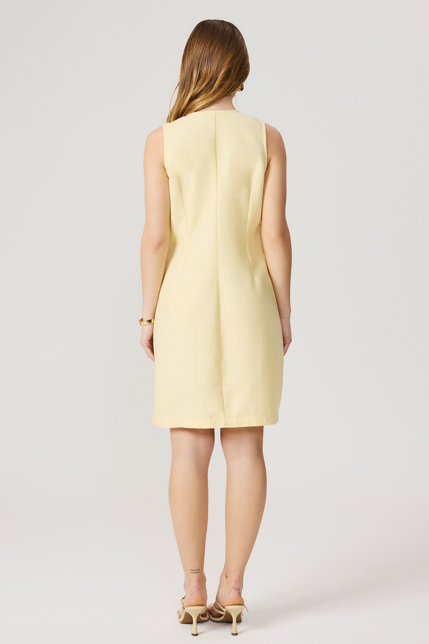 O vestido curto amarelo manteiga da Fato Básico traduz frescor e sofisticação em uma peça única. Sua modelagem reta e minimalista valoriza o corpo de forma natural, enquanto a cor suave traz luminosidade ao look. É uma escolha elegante e versátil para o dia a dia ou ocasiões casuais.